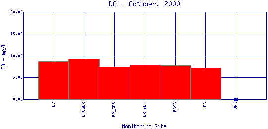 Dissolved Oxygen (DO) is the amount of oxygen dissolved in the water. DO is a very important indicator of a water body's ability to support aquatic life. The amount of DO in water depends on several factors, including temperature (the colder the water, the more oxygen can be dissolved); the volume and velocity of water flowing in the water body; and the amount of organisms using oxygen for respiration. The amount of oxygen dissolved in water is expressed as a concentration, in milligrams per liter (mg/l) of water. The optimal DO for adult brown trout is 9-12 mg/l. Human activities that affect DO levels include the removal of riparian vegetation, runoff from roads, and sewage discharge.  | ||||||||||||||||||||||||||||||
