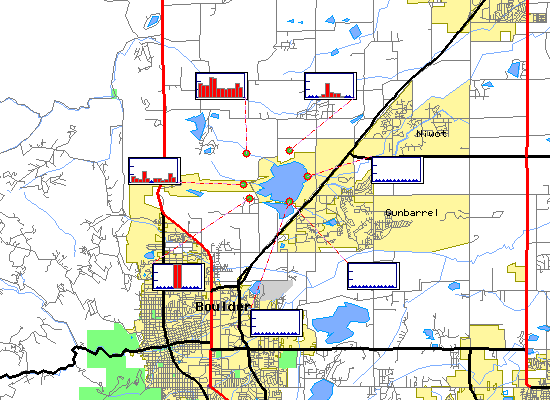 Flow is the volume of water moving past a point in a unit of time. Two things make up flow: the volume of water in the stream, and the velocity of the water moving past a given point. Flow affects the concentration of dissolved oxygen, natural substances, and pollutants in a water body. Flow is measured in units of cubic feet per second (cfs). Peak flows for Boulder Creek in the spring can reach as high as 300-800 cfs and as low as 10-50 cfs in the fall months. | |||||||