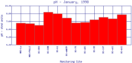 pH measures hydrogen concentration in water. pH is presented on a scale from 0 to 14. A solution with a pH value of 7 is neutral; a solution with a pH value less than 7 is acidic; a solution with a pH value greater than 7 is basic. Natural waters usually have a pH between 6 and 9. The scale is negatively logarithmic, so each whole number (reading downward) is ten times the preceding one (for example, pH 5.5 is 100 times as acidic as pH 7.5). The pH of natural waters can be made acidic or basic by human activities. For example, coal-burning power plants and heavy automobile traffic can produce nitrous oxides and sulfur dioxide, making the rain and snow highly acidic.