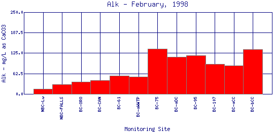 Alkalinity refers to how well a water body can neutralize acids. Alkalinity measures the amount of alkaline compounds in water, such as carbonates (CO3 2-), bicarbonates (HCO3 -), and hydroxides (OH-). These compounds are natural buffers that can remove excess hydrogen ions that have been added from sources such as acid rain or acid mine drainage. Alkalinity mitigates or relieves metals toxicity by using available HCO3 - and CO3 2- to take metals out of solution, thus making it unavailable to fish. Alkalinity is affected by the geology of the watershed; watersheds containing limestone will have a higher alkalinity than watersheds where granite is predominant. The Boulder Creek Watershed is composed primarily of granite rocks, thus the water has a lower alkalinity content.