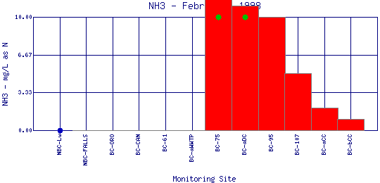 The above map indicates water quality monitoring sites. To view data at a specific site select it from the map with the mouse.