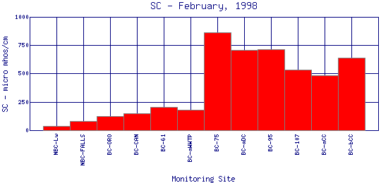 Specific Conductance is a measure of how well water can pass an electrical current. It is an indirect measure of the presence of inorganic dissolved solids, such as chloride, nitrate, sulfate, phosphate, sodium, magnesium, calcium, and iron. These substances conduct electricity because they are negatively or positively charged when dissolved in water. The concentration of dissolved solids, or the conductivity, is affected by the bedrock and soil in the watershed. It is also affected by human influences. For example, agricultural runoff can raise conductivity because of the presence of phosphate and nitrate.