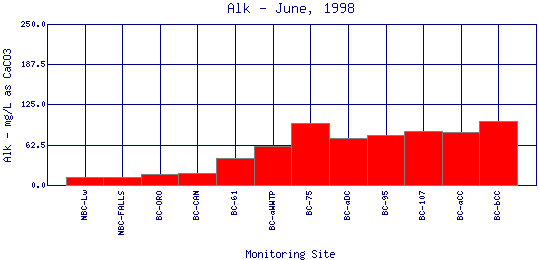 Alkalinity refers to how well a water body can neutralize acids. Alkalinity measures the amount of alkaline compounds in water, such as carbonates (CO3 2-), bicarbonates (HCO3 -), and hydroxides (OH-). These compounds are natural buffers that can remove excess hydrogen ions that have been added from sources such as acid rain or acid mine drainage. Alkalinity mitigates or relieves metals toxicity by using available HCO3 - and CO3 2- to take metals out of solution, thus making it unavailable to fish. Alkalinity is affected by the geology of the watershed; watersheds containing limestone will have a higher alkalinity than watersheds where granite is predominant. The Boulder Creek Watershed is composed primarily of granite rocks, thus the water has a lower alkalinity content.