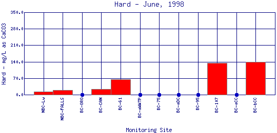 Hardness generally refers to the amount of calcium and magnesium in water. In household use, these cations (ions with a charge greater than +1) can prevent soap from sudsing and leave behind a white scum in bathtubs. In the aquatic environment, calcium and magnesium help keep fish from absorbing metals, such as lead, arsenic, and cadmium, into their bloodstream through their gills. Therefore, the harder the water, the less easy it is for toxic metals to absorb onto gills. Water in the Boulder Creek watershed is generally soft because the water comes mainly from melting snow which is low in minerals and metals.
