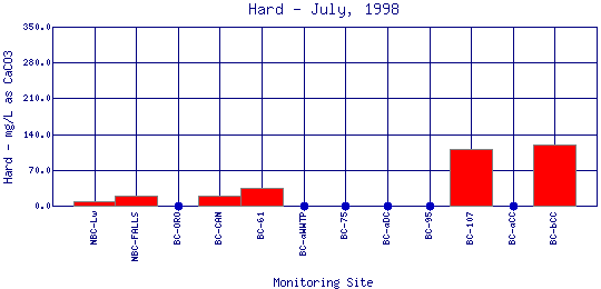 Hardness generally refers to the amount of calcium and magnesium in water. In household use, these cations (ions with a charge greater than +1) can prevent soap from sudsing and leave behind a white scum in bathtubs. In the aquatic environment, calcium and magnesium help keep fish from absorbing metals, such as lead, arsenic, and cadmium, into their bloodstream through their gills. Therefore, the harder the water, the less easy it is for toxic metals to absorb onto gills. Water in the Boulder Creek watershed is generally soft because the water comes mainly from melting snow which is low in minerals and metals.