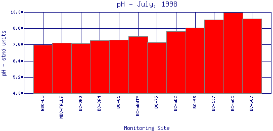 pH measures hydrogen concentration in water. pH is presented on a scale from 0 to 14. A solution with a pH value of 7 is neutral; a solution with a pH value less than 7 is acidic; a solution with a pH value greater than 7 is basic. Natural waters usually have a pH between 6 and 9. The scale is negatively logarithmic, so each whole number (reading downward) is ten times the preceding one (for example, pH 5.5 is 100 times as acidic as pH 7.5). The pH of natural waters can be made acidic or basic by human activities. For example, coal-burning power plants and heavy automobile traffic can produce nitrous oxides and sulfur dioxide, making the rain and snow highly acidic.