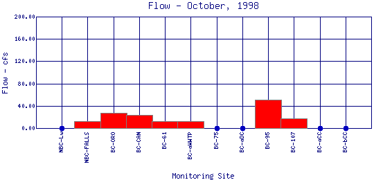 Flow is the volume of water moving past a point in a unit of time. Two things make up flow: the volume of water in the stream, and the velocity of the water moving past a given point. Flow affects the concentration of dissolved oxygen, natural substances, and pollutants in a water body. Flow is measured in units of cubic feet per second (cfs). Peak flows for Boulder Creek in the spring can reach as high as 300-800 cfs and as low as 10-50 cfs in the fall months.