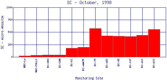 Specific Conductance is a measure of how well water can pass an electrical current. It is an indirect measure of the presence of inorganic dissolved solids, such as chloride, nitrate, sulfate, phosphate, sodium, magnesium, calcium, and iron. These substances conduct electricity because they are negatively or positively charged when dissolved in water. The concentration of dissolved solids, or the conductivity, is affected by the bedrock and soil in the watershed. It is also affected by human influences. For example, agricultural runoff can raise conductivity because of the presence of phosphate and nitrate.