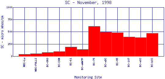 Specific Conductance is a measure of how well water can pass an electrical current. It is an indirect measure of the presence of inorganic dissolved solids, such as chloride, nitrate, sulfate, phosphate, sodium, magnesium, calcium, and iron. These substances conduct electricity because they are negatively or positively charged when dissolved in water. The concentration of dissolved solids, or the conductivity, is affected by the bedrock and soil in the watershed. It is also affected by human influences. For example, agricultural runoff can raise conductivity because of the presence of phosphate and nitrate.