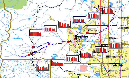 pH measures hydrogen concentration in water. pH is presented on a scale from 0 to 14. A solution with a pH value of 7 is neutral; a solution with a pH value less than 7 is acidic; a solution with a pH value greater than 7 is basic. Natural waters usually have a pH between 6 and 9. The scale is negatively logarithmic, so each whole number (reading downward) is ten times the preceding one (for example, pH 5.5 is 100 times as acidic as pH 7.5). The pH of natural waters can be made acidic or basic by human activities. For example, coal-burning power plants and heavy automobile traffic can produce nitrous oxides and sulfur dioxide, making the rain and snow highly acidic. | |||||||||