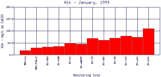 Alkalinity refers to how well a water body can neutralize acids. Alkalinity measures the amount of alkaline compounds in water, such as carbonates (CO3 2-), bicarbonates (HCO3 -), and hydroxides (OH-). These compounds are natural buffers that can remove excess hydrogen ions that have been added from sources such as acid rain or acid mine drainage. Alkalinity mitigates or relieves metals toxicity by using available HCO3 - and CO3 2- to take metals out of solution, thus making it unavailable to fish. Alkalinity is affected by the geology of the watershed; watersheds containing limestone will have a higher alkalinity than watersheds where granite is predominant. The Boulder Creek Watershed is composed primarily of granite rocks, thus the water has a lower alkalinity content.
