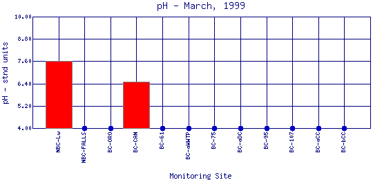 pH measures hydrogen concentration in water. pH is presented on a scale from 0 to 14. A solution with a pH value of 7 is neutral; a solution with a pH value less than 7 is acidic; a solution with a pH value greater than 7 is basic. Natural waters usually have a pH between 6 and 9. The scale is negatively logarithmic, so each whole number (reading downward) is ten times the preceding one (for example, pH 5.5 is 100 times as acidic as pH 7.5). The pH of natural waters can be made acidic or basic by human activities. For example, coal-burning power plants and heavy automobile traffic can produce nitrous oxides and sulfur dioxide, making the rain and snow highly acidic. | |||||||||||||||||||||||||||||||||||||||||||||