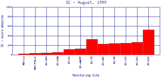 Specific Conductance is a measure of how well water can pass an electrical current. It is an indirect measure of the presence of inorganic dissolved solids, such as chloride, nitrate, sulfate, phosphate, sodium, magnesium, calcium, and iron. These substances conduct electricity because they are negatively or positively charged when dissolved in water. The concentration of dissolved solids, or the conductivity, is affected by the bedrock and soil in the watershed. It is also affected by human influences. For example, agricultural runoff can raise conductivity because of the presence of phosphate and nitrate. | |||||||||||||||||||||||||||||||||||||||||||||