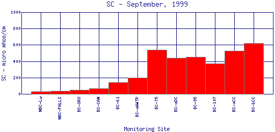 Specific Conductance is a measure of how well water can pass an electrical current. It is an indirect measure of the presence of inorganic dissolved solids, such as chloride, nitrate, sulfate, phosphate, sodium, magnesium, calcium, and iron. These substances conduct electricity because they are negatively or positively charged when dissolved in water. The concentration of dissolved solids, or the conductivity, is affected by the bedrock and soil in the watershed. It is also affected by human influences. For example, agricultural runoff can raise conductivity because of the presence of phosphate and nitrate.
