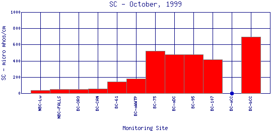 Specific Conductance is a measure of how well water can pass an electrical current. It is an indirect measure of the presence of inorganic dissolved solids, such as chloride, nitrate, sulfate, phosphate, sodium, magnesium, calcium, and iron. These substances conduct electricity because they are negatively or positively charged when dissolved in water. The concentration of dissolved solids, or the conductivity, is affected by the bedrock and soil in the watershed. It is also affected by human influences. For example, agricultural runoff can raise conductivity because of the presence of phosphate and nitrate.