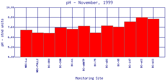 pH measures hydrogen concentration in water. pH is presented on a scale from 0 to 14. A solution with a pH value of 7 is neutral; a solution with a pH value less than 7 is acidic; a solution with a pH value greater than 7 is basic. Natural waters usually have a pH between 6 and 9. The scale is negatively logarithmic, so each whole number (reading downward) is ten times the preceding one (for example, pH 5.5 is 100 times as acidic as pH 7.5). The pH of natural waters can be made acidic or basic by human activities. For example, coal-burning power plants and heavy automobile traffic can produce nitrous oxides and sulfur dioxide, making the rain and snow highly acidic.