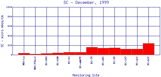 Specific Conductance is a measure of how well water can pass an electrical current. It is an indirect measure of the presence of inorganic dissolved solids, such as chloride, nitrate, sulfate, phosphate, sodium, magnesium, calcium, and iron. These substances conduct electricity because they are negatively or positively charged when dissolved in water. The concentration of dissolved solids, or the conductivity, is affected by the bedrock and soil in the watershed. It is also affected by human influences. For example, agricultural runoff can raise conductivity because of the presence of phosphate and nitrate.