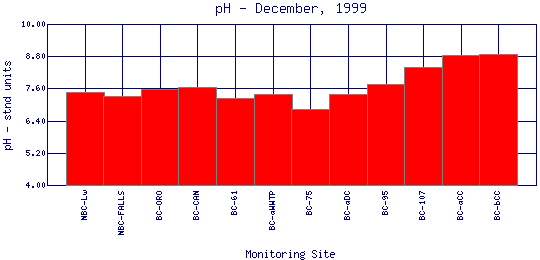 pH measures hydrogen concentration in water. pH is presented on a scale from 0 to 14. A solution with a pH value of 7 is neutral; a solution with a pH value less than 7 is acidic; a solution with a pH value greater than 7 is basic. Natural waters usually have a pH between 6 and 9. The scale is negatively logarithmic, so each whole number (reading downward) is ten times the preceding one (for example, pH 5.5 is 100 times as acidic as pH 7.5). The pH of natural waters can be made acidic or basic by human activities. For example, coal-burning power plants and heavy automobile traffic can produce nitrous oxides and sulfur dioxide, making the rain and snow highly acidic.