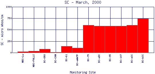 Specific Conductance is a measure of how well water can pass an electrical current. It is an indirect measure of the presence of inorganic dissolved solids, such as chloride, nitrate, sulfate, phosphate, sodium, magnesium, calcium, and iron. These substances conduct electricity because they are negatively or positively charged when dissolved in water. The concentration of dissolved solids, or the conductivity, is affected by the bedrock and soil in the watershed. It is also affected by human influences. For example, agricultural runoff can raise conductivity because of the presence of phosphate and nitrate.
