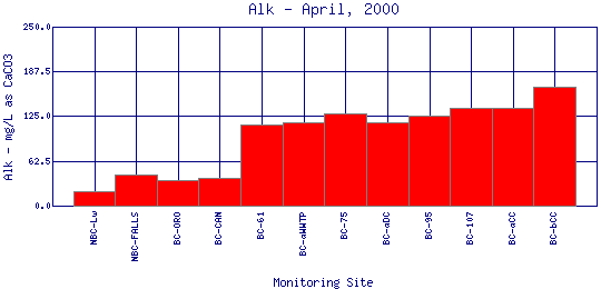 Alkalinity refers to how well a water body can neutralize acids. Alkalinity measures the amount of alkaline compounds in water, such as carbonates (CO3 2-), bicarbonates (HCO3 -), and hydroxides (OH-). These compounds are natural buffers that can remove excess hydrogen ions that have been added from sources such as acid rain or acid mine drainage. Alkalinity mitigates or relieves metals toxicity by using available HCO3 - and CO3 2- to take metals out of solution, thus making it unavailable to fish. Alkalinity is affected by the geology of the watershed; watersheds containing limestone will have a higher alkalinity than watersheds where granite is predominant. The Boulder Creek Watershed is composed primarily of granite rocks, thus the water has a lower alkalinity content.