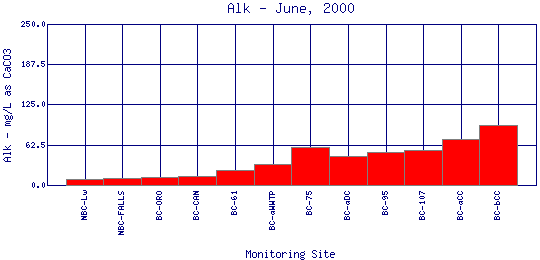 Alkalinity refers to how well a water body can neutralize acids. Alkalinity measures the amount of alkaline compounds in water, such as carbonates (CO3 2-), bicarbonates (HCO3 -), and hydroxides (OH-). These compounds are natural buffers that can remove excess hydrogen ions that have been added from sources such as acid rain or acid mine drainage. Alkalinity mitigates or relieves metals toxicity by using available HCO3 - and CO3 2- to take metals out of solution, thus making it unavailable to fish. Alkalinity is affected by the geology of the watershed; watersheds containing limestone will have a higher alkalinity than watersheds where granite is predominant. The Boulder Creek Watershed is composed primarily of granite rocks, thus the water has a lower alkalinity content.