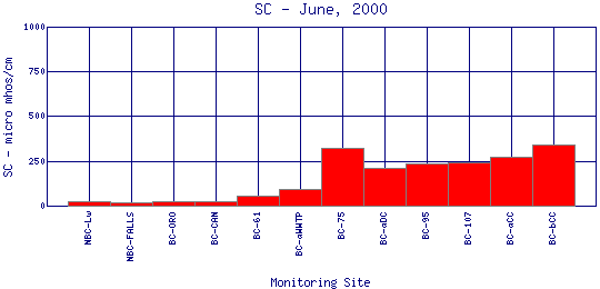 Specific Conductance is a measure of how well water can pass an electrical current. It is an indirect measure of the presence of inorganic dissolved solids, such as chloride, nitrate, sulfate, phosphate, sodium, magnesium, calcium, and iron. These substances conduct electricity because they are negatively or positively charged when dissolved in water. The concentration of dissolved solids, or the conductivity, is affected by the bedrock and soil in the watershed. It is also affected by human influences. For example, agricultural runoff can raise conductivity because of the presence of phosphate and nitrate.