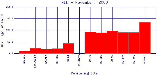 Alkalinity refers to how well a water body can neutralize acids. Alkalinity measures the amount of alkaline compounds in water, such as carbonates (CO3 2-), bicarbonates (HCO3 -), and hydroxides (OH-). These compounds are natural buffers that can remove excess hydrogen ions that have been added from sources such as acid rain or acid mine drainage. Alkalinity mitigates or relieves metals toxicity by using available HCO3 - and CO3 2- to take metals out of solution, thus making it unavailable to fish. Alkalinity is affected by the geology of the watershed; watersheds containing limestone will have a higher alkalinity than watersheds where granite is predominant. The Boulder Creek Watershed is composed primarily of granite rocks, thus the water has a lower alkalinity content.